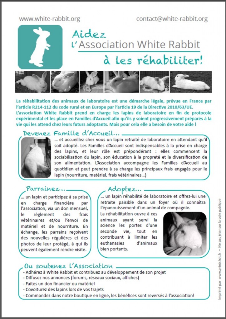 L’association White Rabbit vient d’élaborer sa première affiche, destinée à diffuser ses actions, mais également à recruter Familles d’Accueil, parrains et adoptants au sein du milieu scientifique.