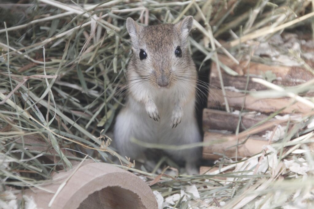 La gerbille de Mongolie (Meriones Unguculatus) est la seule espèce de gerbille domestique. Son nom latin signifie “guerrier griffu” en référence à sa territorialité. Ce petit rongeur mesure environ 10 cm (sans la queue), pèse entre 55 et 100 g et vit généralement 3 à 5 ans en captivité.